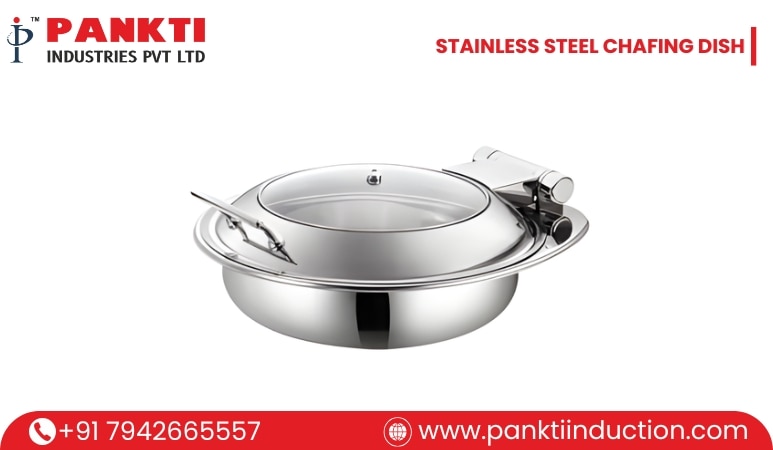 Stainless Steel Chafing Dish Manufacturer in India. Buffets, catering events, and restaurants demand reliable food warming solutions. Pankti Industries Pvt. Ltd., a leading Stainless Steel Chafing Dish Manufacturer in India, offers a range of chafing dishes that combine durability, elegance, and practicality. Designed with high-quality stainless steel, these dishes ensure your food remains warm and presentable for extended periods. Technical Specifications Option 1 – 5 L Stainless Steel Chafing Dish • Capacity: 5 L • Shape: Round • Material: Stainless Steel • Color: Silver • Pack Type: Wooden Box Option 2 – 7 L Stainless Steel Chafing Dish • Capacity: 7 L • Shape: Round • Material: Stainless Steel • Color: Silver • Pack Type: Wooden Box Option 3 – 10 L Stainless Steel Chafing Dish • Capacity: 10 L • Shape: Round • Material: Stainless Steel • Color: Silver • Pack Type: Wooden Box How It Works A Stainless Steel Chafing Dish operates on a simple yet effective principle. Food is placed in the stainless steel pan, which sits above a heat source, typically a fuel-based burner or electric heater. The heat gently warms the food without overcooking it, ensuring it stays fresh and ready to serve. The stainless steel construction provides excellent heat retention and an elegant, polished look suitable for any professional setting. Benefits & Advantages • Keeps Food Warm: Maintains optimal temperature for extended periods, ideal for buffets and catering. • Durable & Hygienic: Stainless steel body ensures longevity, easy cleaning, and resistance to rust. • Elegant Design: Sleek silver finish enhances presentation at events or in restaurants. • Versatile Usage: Suitable for hotels, restaurants, catering services, and large home gatherings. • Safe & User-Friendly: Packaged in a wooden box for safe transport and convenient handling. • Multiple Capacities: Available in 5L, 7L, and 10L, catering to different serving requirements. Why Choose Pankti Industries Pvt. Ltd.? As a trusted Stainless Steel Chafing Dish Manufacturer in India, Pankti Industries Pvt. Ltd. prioritizes quality, reliability, and customer satisfaction. Their chafing dishes are designed for seamless operation, elegant presentation, and long-lasting durability—making them the perfect choice for professional kitchens and catering services. Upgrade your buffet or catering setup with a Stainless Steel Chafing Dish from Pankti Industries Pvt. Ltd. Ensure your guests enjoy warm, fresh, and visually appealing dishes every time.